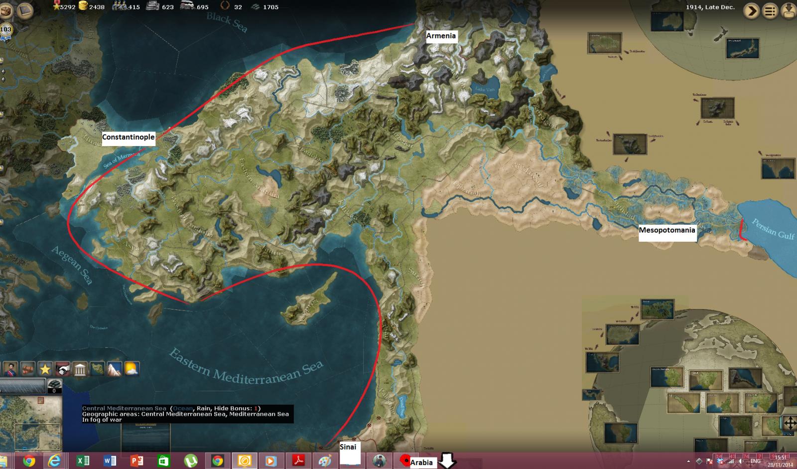 The BEF is tough, but it's small. I'd say keep a floating reserve available to cover the Dalmatian coastline with the Austrians, and be prepared with the Ottomans. You don't want to leave Anatolia or Constantinople open to major landings, the Middle East is expendable if he hits you hard there. If he gets the BEF bogged down in a Gallipoli type venture, I think this is most fortunate for you as it relieves you of a further threat in the West.