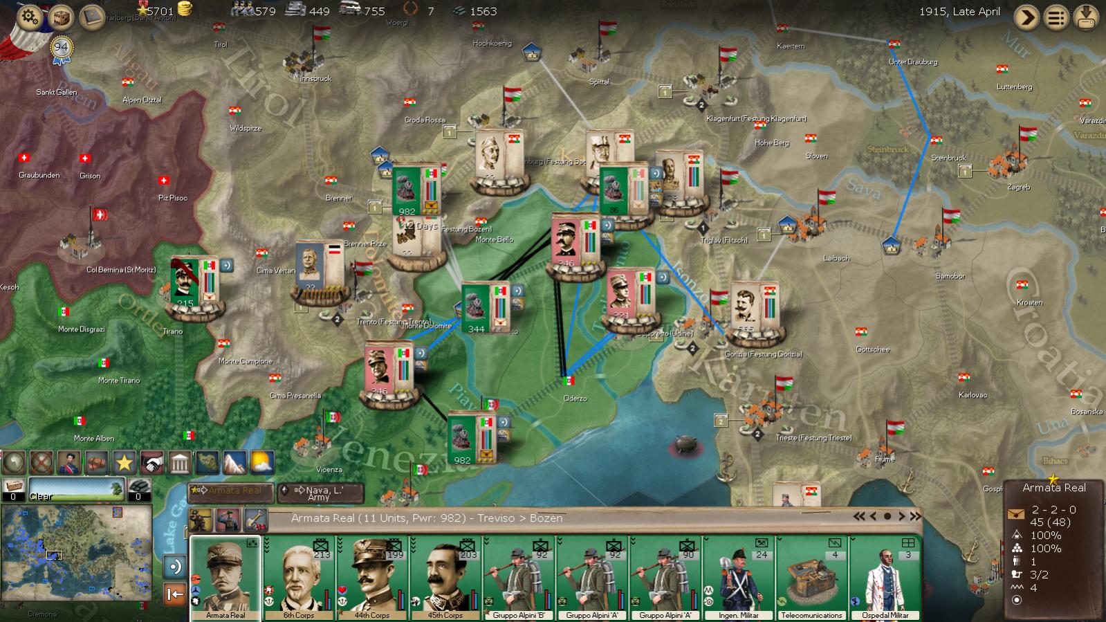 After our bloodless (why?) victory in Bozen, we have somewhat trapped the Austrian Army in Trento. They can either escape over the mountains in Cima Vertan, hold in place waiting for my supply situation in Bozen to fall apart, counterattack into Bozen, or attack south into Italy (highly unlikely).