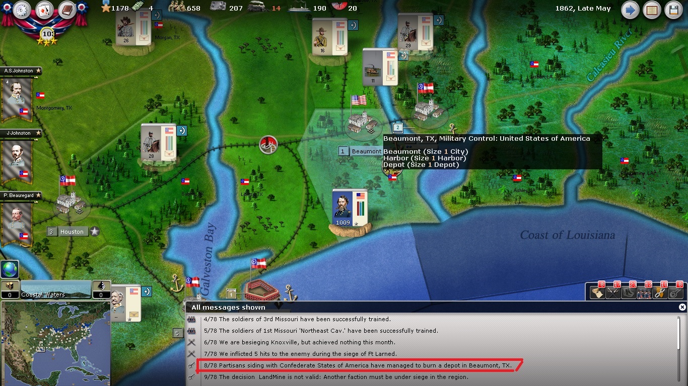 W.Barksdale wrote:Kindly see the attached. I direct your attention to the region of Beaumont TX. Partisan raid ordered and is successful the following turn. However, federal depot remains intact. I conclude the decision card is not working as intended.