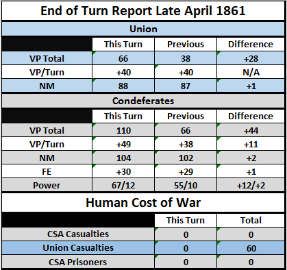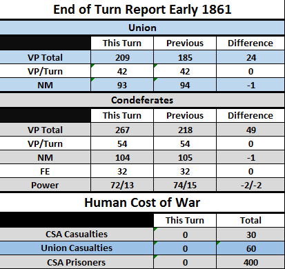 Yeesh on the blockade which backfired. I'll have to watch that FE closely as the rebels embargo netted them their swing for a +25 FE swing in the CSA's favor right off the bat! And Straight Arrow has matched me with his treasury decisions. He also did two requisitions and sold cotton to my four requisitions. Well folks it's going to get busy fast with all that money floating around in both our hands. I'll be keeping track of casualties, NM, VP, etc in a table format, let me know if you have issues with reading it and I can pump up the font some.
