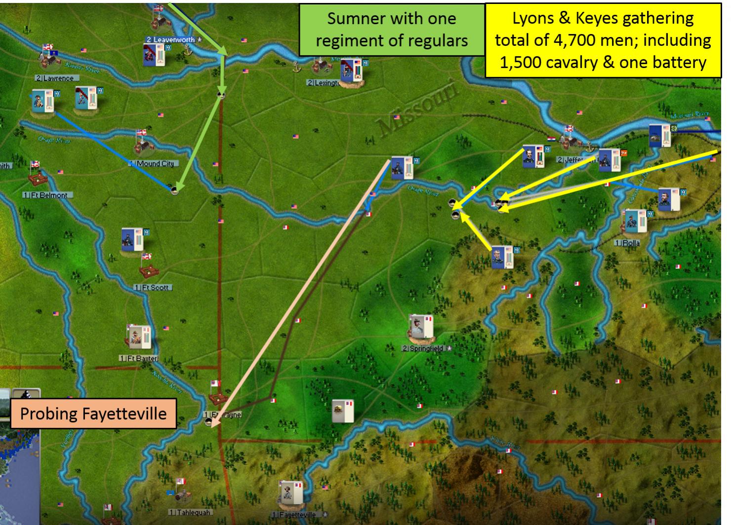 [color="#0000CD"]WEST:[/color] Lots of various forces unlocked, mainly reserve brigades. Still they're better than nothing! Most will move to secure Cairo and StLo which will be denuded of most defenses as Lyons will be moving all available forces in a bid for Springfield. Lyons will take 2,100 infantry and a battery directy to Jefferson City with an additional 1,300 arriving later. One brigade of volunteer cavalry will attempt to move next to Springfield in order to get some recon going. A cavalry regiment will also move to gain MC in the rail line between Jefferson City & StLo. The two cavalry regiments I have in Kansas will start moving Southeast. Builds included some more infantry brigades rounded out with a cavalry unit, artillery batteries, and a timberclad.