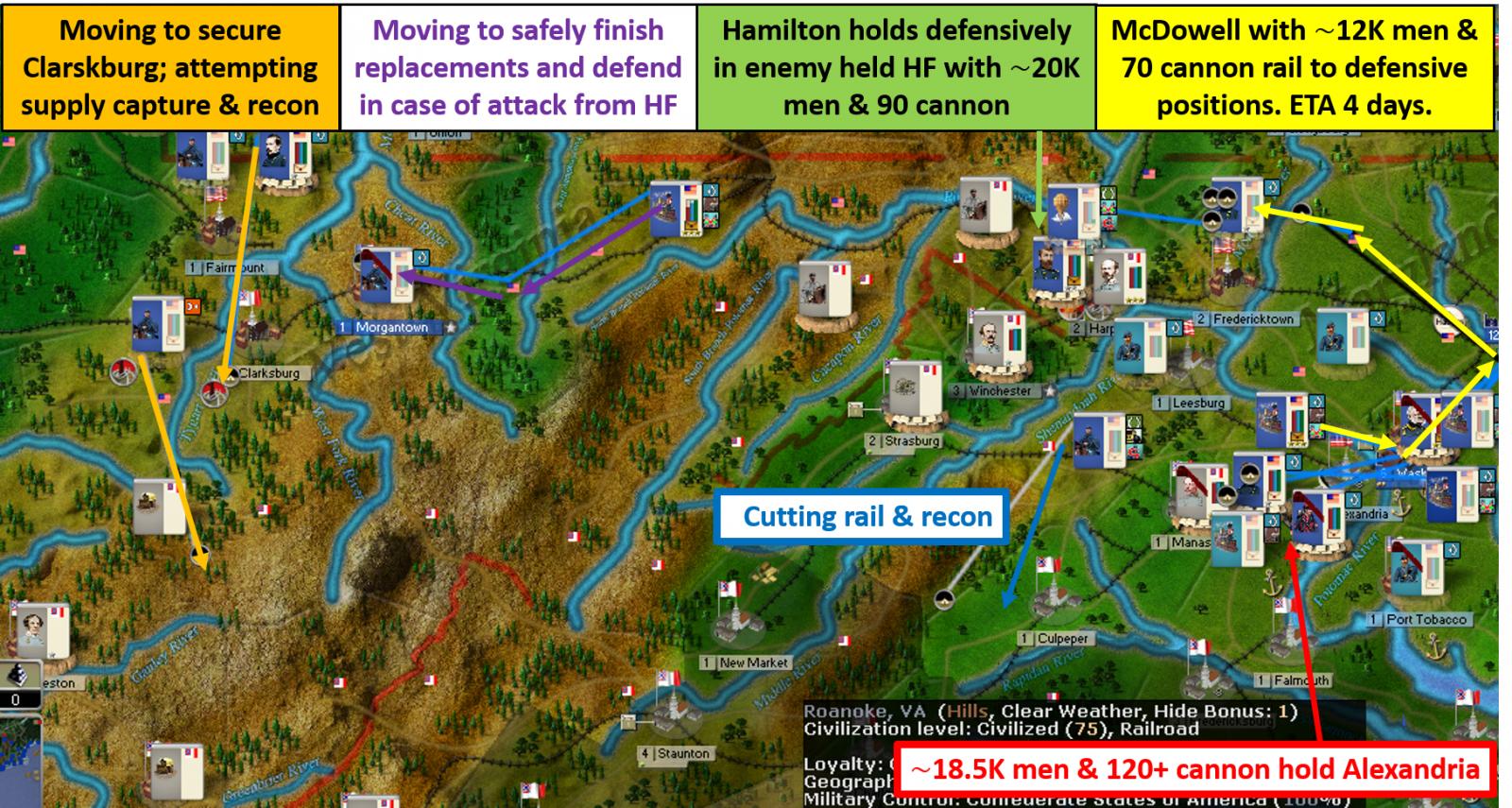 [color="#008080"]EAST:[/color] Things are pretty quiet in the East. I’ll continue to strengthen my defenses by bringing in new builds and shifting some forces around. Manassas remains strongly defended. McDowell will rail his army to Leesburg and a small cavalry force will try to push out a single enemy cavalry regiment in Falmouth and get some insight into what Arrow’s defenses further South are looking like.