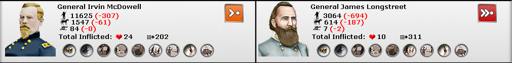 [color="#008080"]EAST:[/color] McDowell managed to rail in and catch Jackson and his elite brigade before they could withdraw. Jackson came in expecting to pick on a weak volunteer brigade. But his quarry escaped without loss and he quickly turned from hunter to hunted when McDowell came calling. The casualty figures are more than acceptable considering the terrain and the fact I was going up against the cream of the CSA in terms of soldiers and generalship. Plus I earned 1 NM from the results of the battle! So careful guys when sending a small force near a much larger one that can hop on the railroad and catch you before getting back out.