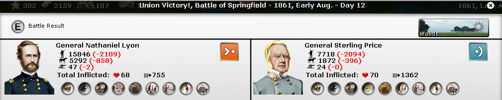 [color="#008080"]TRANS-MISSISSIPPI:[/color] General Lyon and his overwhelming forces were able to capture Springfield after a short stiff fight. This removes all the Missouri forces from Arrow’s force pool, hopefully for the rest of the game. I don’t think he was able to recruit too many of those forces either before he was pushed out. Additionally, with Springfield in my hands, it’ll be harder for CSA raiders to go after northern Missouri targets. After the battle with McCullough, Lyon's stack easily overwhelmed the militia garrison to add to Arrow's losses this turn.