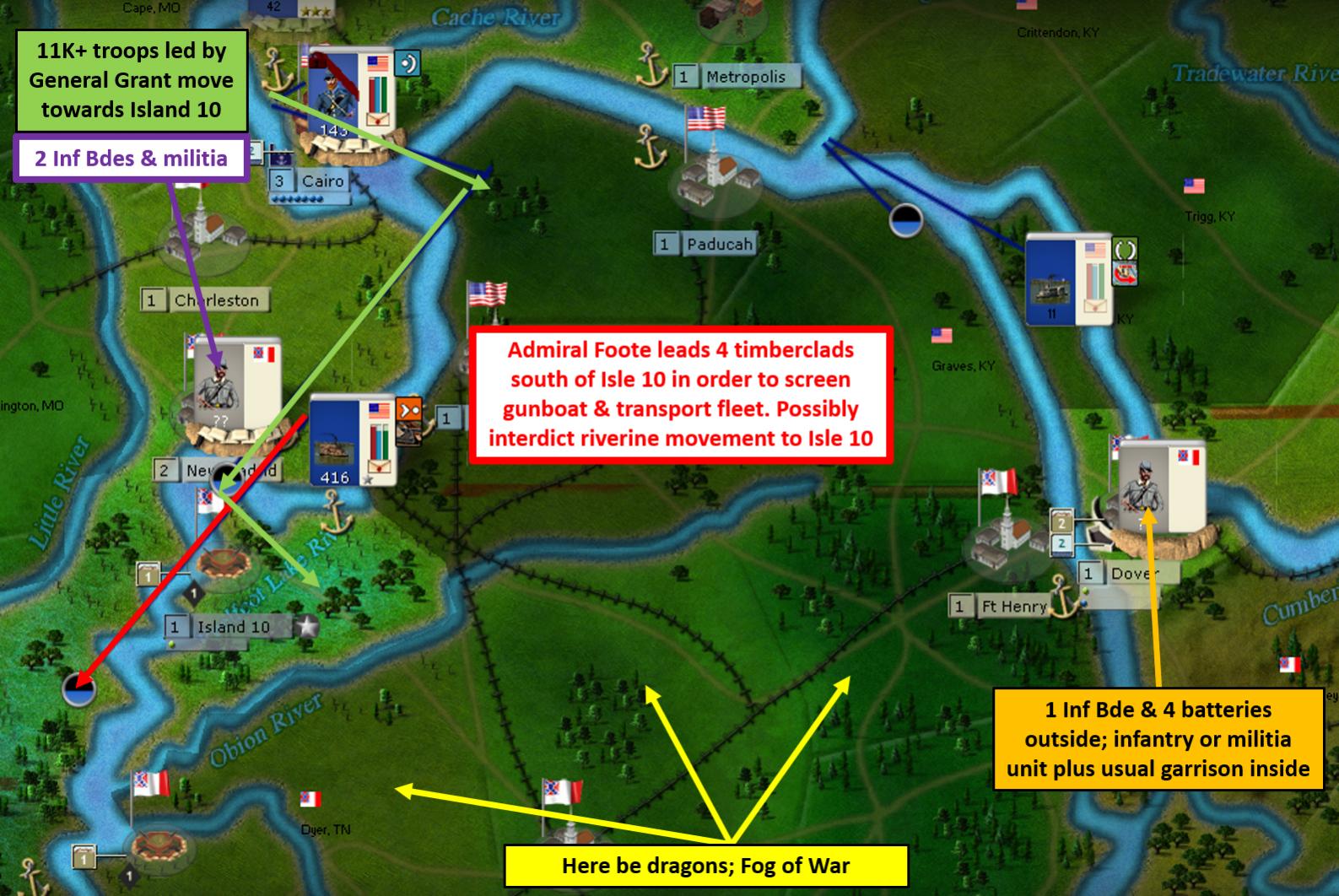 [color="#008080"]WEST:[/color] With the expected attack into Tennessee, I will be creating a new theater. This theater will include operations along the Mississippi, Tennessee, and Kentucky when that state joins the war. Lyons will be highlighted in the next theater. I’ve been gathering a force in Cairo and the arrival of General Grant comes at a fortuitous time. Earlier I’d sent some ships down to scout out Donelson and Island 10 and there is some very intriguing intelligence on those positions.