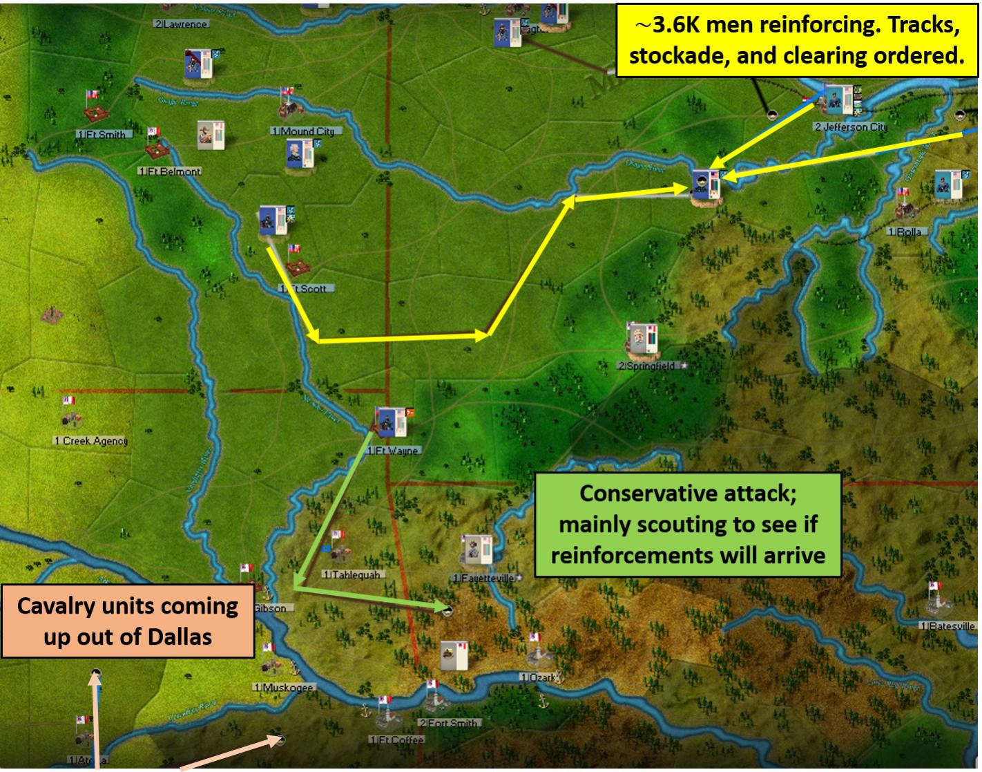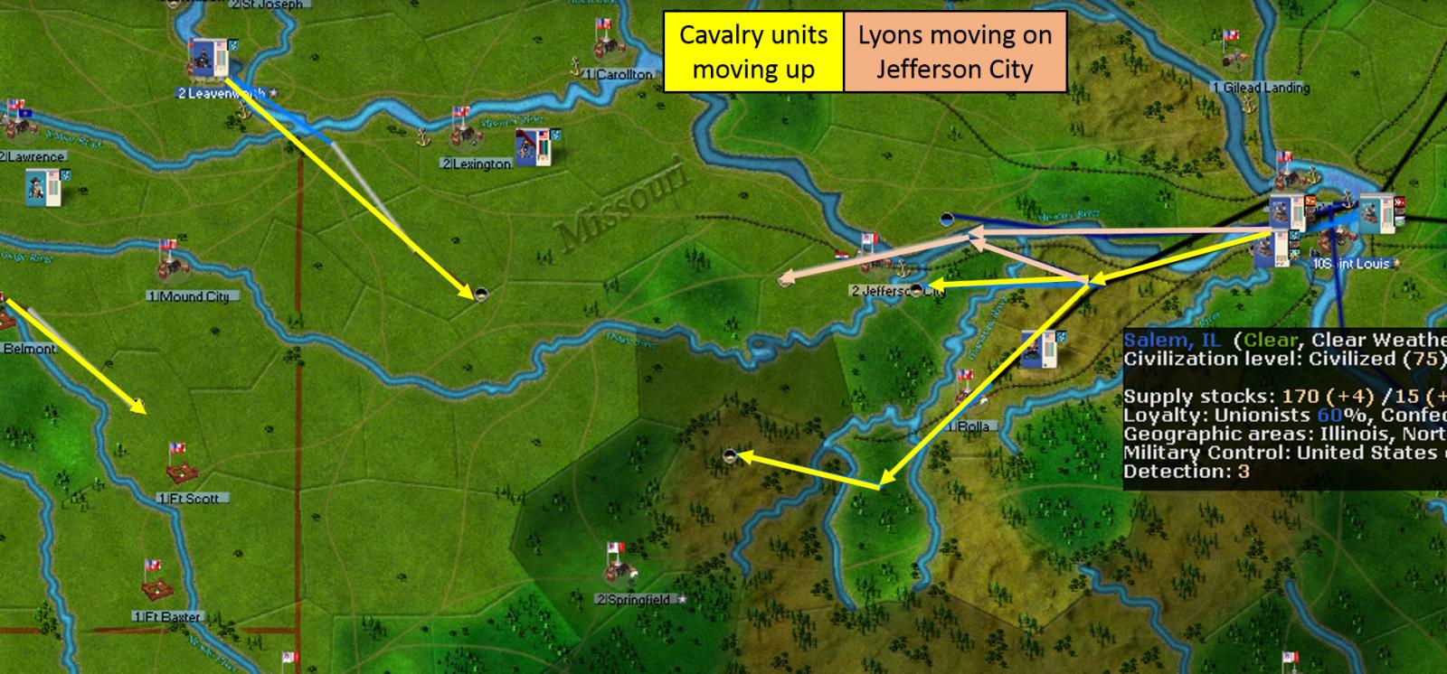 Nice move on the first turn Illinois militia to Rolla. I think it could only be countered if the CSA player ordered an under construction unit to blow the depot - assuming the weather favors the union.