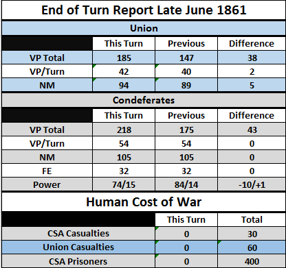Yeesh on the blockade which backfired. I'll have to watch that FE closely as the rebels embargo netted them their swing for a +25 FE swing in the CSA's favor right off the bat! And Straight Arrow has matched me with his treasury decisions. He also did two requisitions and sold cotton to my four requisitions. Well folks it's going to get busy fast with all that money floating around in both our hands. I'll be keeping track of casualties, NM, VP, etc in a table format, let me know if you have issues with reading it and I can pump up the font some.