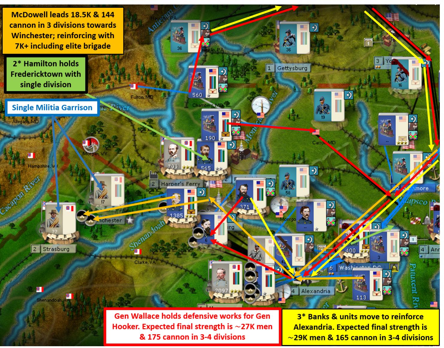 Maybe I’m feeling overconfident from a couple good wins in the East, but McDowell is going on the offensive this turn! Yeah, I think it’s crazy too. But I have identified a weakness in Arrow’s defensive positioning that I hope to exploit and for better or for worse, McDowell’s the man in charge. I’ve been in strength at Leesburg multiple times and Arrow has never reacted by strengthening Winchester. I’ve also never directly threatened Winchester, so it just has a single militia unit twiddling its thumbs. I didn’t think I had the manpower in the past to take Winchester and hold a supply and possible retreat path open while still holding Alexandria; but between the new builds and the divisional formations that has changed. It’s possible that without the need to defend Manassas from a possible suicidal attack and with the introduction of the divisional formations, Arrow will restructure his defensive lines. But 2K strongly entrenched is major overkill for Manassas against poor Union leadership, so I don’t know if he was thinking defensively so much as keeping a strong force consolidated in order to attack. Regardless, I’m doubting Arrow will put enough in Winchester to stop me. If all goes as planned, I should have an army sitting on Arrow’s supply lines to Harper’s Ferry with a strongly entrenched force in good defensive terrain at Leesburg. Hopefully this doesn’t blow up in my face because . . . well McDowell’s leading an offense and that right there is the stuff of Union nightmares and CSA dreams.
