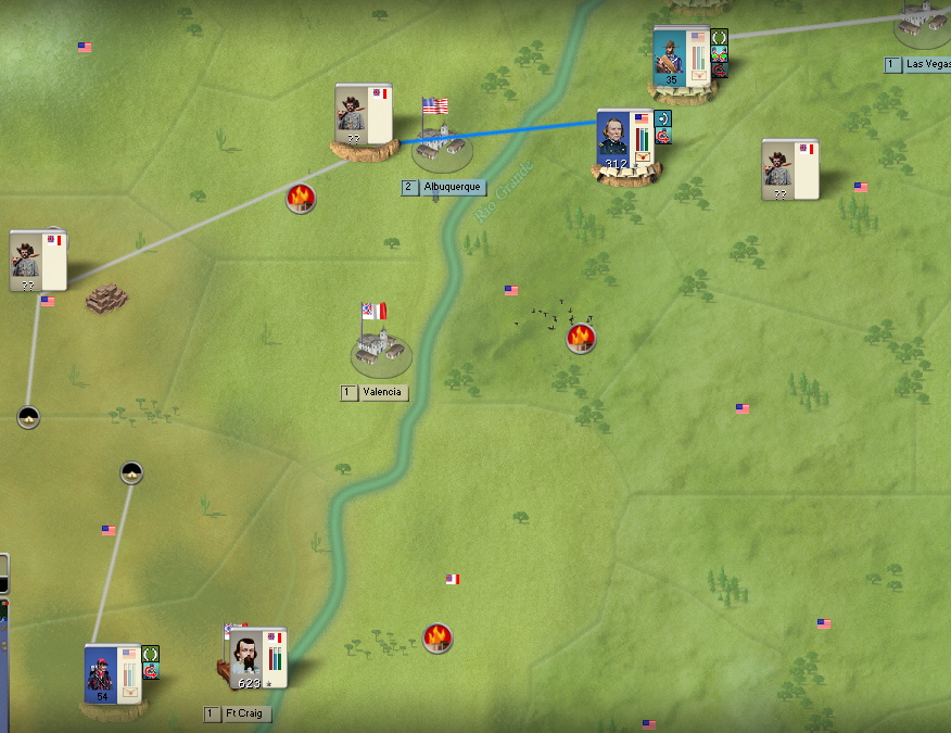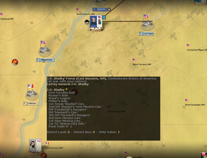 [color="#008080"]FAR WEST:[/color] Well, Shelby’s fast movement sure is a sight to see. Shelby’s entire force made it all the way back to Mesilla in one turn. Mud in this region would have really helped me but alas Mother Nature is not an ally this time around. The ammo for my Tucson force is just about down to nothing and what’s present in Mora isn’t enough to give all my units enough ammo for a single battle. Meanwhile, there’s plenty of ammo in two locked supply wagons. I’m going to cross my fingers and send out my fast movers to pick up ammo from the wagon at Mora. Hopefully Shelby sits for a turn and replaces battle losses, giving me time to pick up ammo and dash back before he comes calling a 2nd time. Two more turns until all of my locked forces become available, I just need to hold out for a little bit longer. At least Carson was active as my force should fight better within a divisional formation.