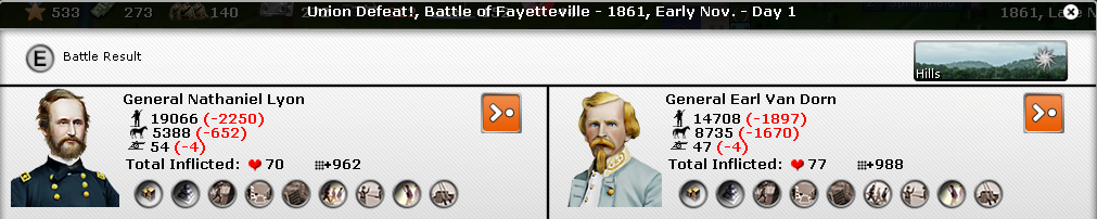 I’m going to pull up here in order to await some reinforcements, regain lost cohesion, and fully stock my wagons up on ammo. The unknown strength of the force at Ft Wayne troubles me. If I’m right, there shouldn’t be too much there. In which case I should be able to safely attack next turn with the fire of a thousand suns; I don’t think that Arrow has a strong enough SPF. If I’m wrong, then it’s possible that what I’m seeing in Fayetteville are reinforcing units brought up from the Red River and I could be leading my force into a loss. Another reason for a delay here is that although the captured depot really upped marginal supply levels, it only replaced some of the ammo used in battle. So I’m still only at 63% for ammo after the last battle for Springfield. I don’t like the prospect of fighting without a full ammo loadout. Barring the presence of major CSA reinforcements, in the next turn or so I expect three tough divisions to fall upon Fayetteville.