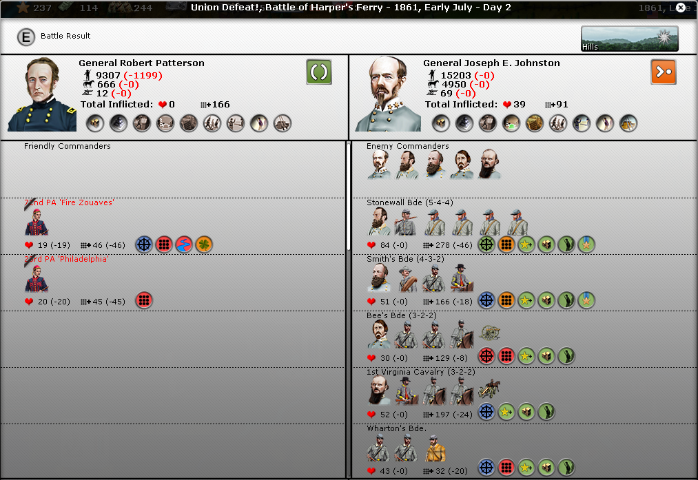 A group of 3 general officers and 3 support units (medical corps, signal corps, and engineering corps) attempted a breakout of Washington DC last turn but were denied. The general officers are in nearby towns recovering from wounds and two of the support units returned to the Army in the capital intact. The supplies of the medical corps unit were captured or destroyed and the men are missing. The unit has been recommissioned in the capital.