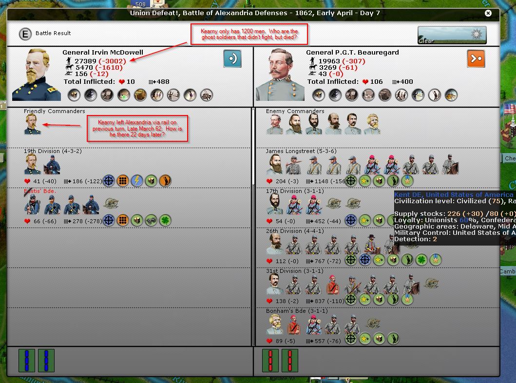 Kearny leaves Alexandria Late March 1862 via rail with about 1200 men to go to New York. A southern partisan is sieging Annapolis, so, I use that to explain why Kearny doesn't reach New York in less than 15 days. (And really, how does 60 men besiege anything?) The next turn is processed and on day 7 of Early April 62, Beauregard finds Kearny still at Alexandria and wipes him out. Oddly, it shows McDowell in command, and shows the US force as 27000 men (in Alexandria). Kearny loses 3000. Ahem, he only had about 1200. WTF is going on? How does he lose units from the garrison, but the garrison doesn't fight? How is Kearny still at Alexandria? Are you assumed to still be at your start location until the date you "arrive" at your destination? Did McDowell command the battle? He and his troops are in the garrison.