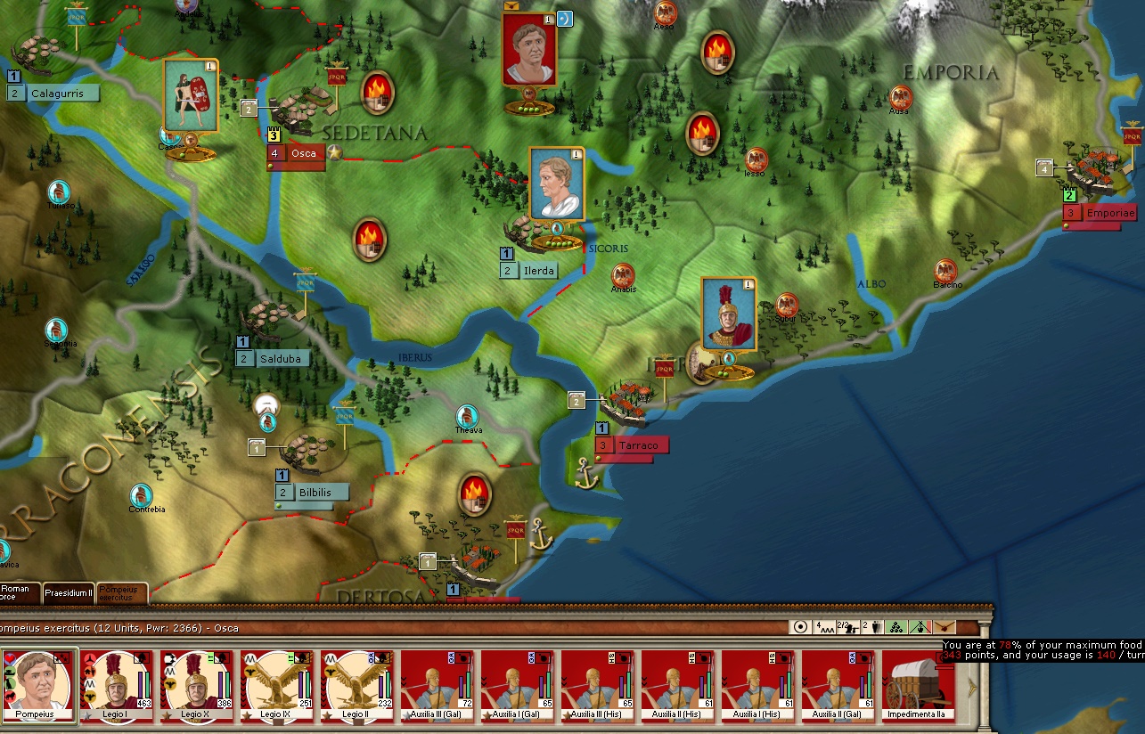 If I had full supply wagons I could leave some in Osca to insure that the defenders didn’t run out of supply in two turns and could try and wait for Sertorius’ army to eat through its supplies. But the current supply situation is critical and leaving isn’t an option right now. By the way this is a game vs. The AI, so I’m very impressed with how it’s playing so far, especially with the recent arrival of the two star leader and his army at Tarraco in what appears to be a move to stop me feeding full wagons to Pompey from Emporiae.