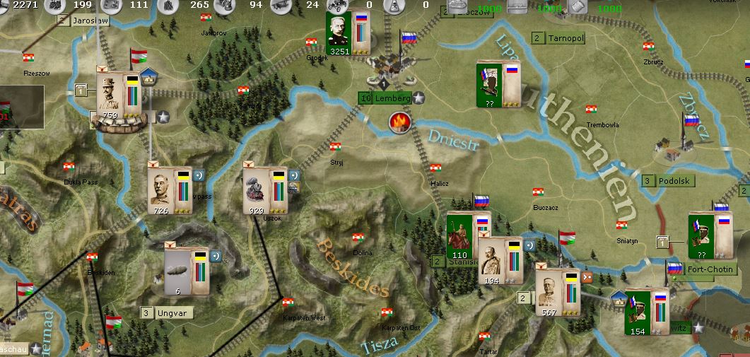 And here's the situation against Russia. He's consolidated 3 or 4 Armies on Lemberg. I have no idea what the Russian starting forces are in this game or how powerful they begin with, so I have no idea where everything is. I moved 3 Armies in and around Lemberg in the hopes he would attack quickly. He didn't. I tried to extricate them, as I simply don't have the firepower for a pitched battle yet. 1st Army lost around 14k to his 4k but was able to retreat. The next line of defense is the mountains southwest of Lemberg and southeast of Przesmyl. The 4th Army could take a swipe at a Russian Corp in Czernowitz, but there's still at least 1 Russian Army unaccounted for and this could be a trap, so I've decided to hold with them.