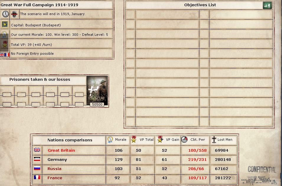 And the overall standings. Look at RU CBT versus mine. Over 2-1. And because the powers are broken up, I don't have the conscripts or war supplies to be able to build much. A Reserve Corp costs 900 conscripts. I get 578 per turn. So 1 Corp every two turns. Not good. I've already printed money (which gives 4000), so I'm fine on money for the time being. And GE NM starts much higher in this mod. Up to 124!