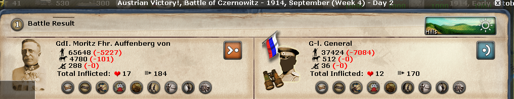 One thing I have to make a remark on - retreating forces are taking way to few losses - many times I attack none dug in and retreating forces - but the losses are often equal - that is why I had to stop the Hindenburg offense in the East - I won every battle, but we had equal losses - my leader and CB far superior at times - my opponent had due to low cohesion only 300CB while I had 1000 - he was not dug in and we take the same losses - really? So I had one Phyrrhic victory after the other - the same in France - look at the losses screen shot - should it really look like this if I win 95%+ of the battles and force the armies into retreat? If they would not retreat ok - but like this it just feels broken and makes it much harder for the CP that needs to go on the offense. How do these units escape so fast??? Usually a retreating force took major losse due to the retreat and being chased down by the attacking force...that is really off - also in Vanilla but maybe Altaris could balance it more as well? ;-D