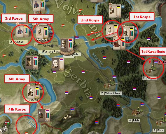 Here's the situation. 9 AH Corps, including 3 understrength MTN corps, plus 3 GE corps are on Belgrade. GE Corps will lead the push down to Velika Plana. Austrians will siege Belgrade and attack remaining Serbians in the area. Pirot has been taken with a Cav Corp (another coming) and will push up to Nish. Putnik is nowhere to been seen. I'm wondering if he got hurt in the last battle.