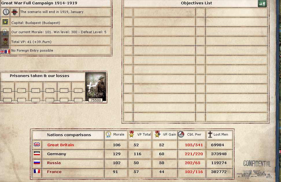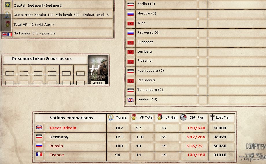 And the overall standings. Look at RU CBT versus mine. Over 2-1. And because the powers are broken up, I don't have the conscripts or war supplies to be able to build much. A Reserve Corp costs 900 conscripts. I get 578 per turn. So 1 Corp every two turns. Not good. I've already printed money (which gives 4000), so I'm fine on money for the time being. And GE NM starts much higher in this mod. Up to 124!