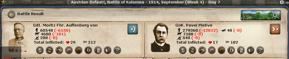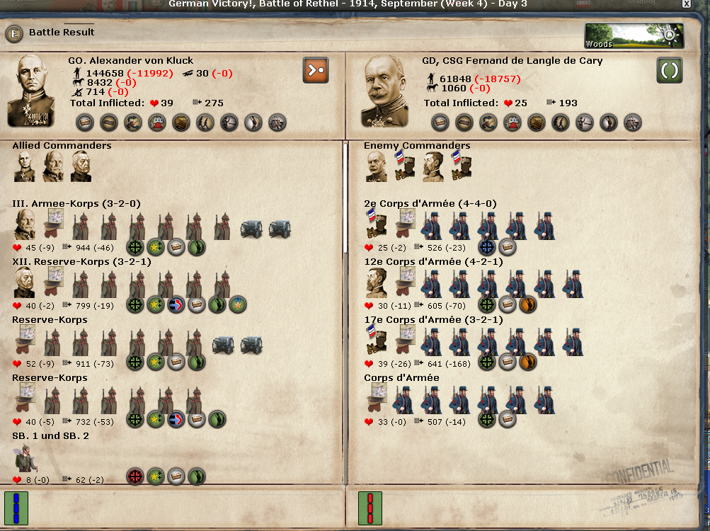 One thing I have to make a remark on - retreating forces are taking way to few losses - many times I attack none dug in and retreating forces - but the losses are often equal - that is why I had to stop the Hindenburg offense in the East - I won every battle, but we had equal losses - my leader and CB far superior at times - my opponent had due to low cohesion only 300CB while I had 1000 - he was not dug in and we take the same losses - really? So I had one Phyrrhic victory after the other - the same in France - look at the losses screen shot - should it really look like this if I win 95%+ of the battles and force the armies into retreat? If they would not retreat ok - but like this it just feels broken and makes it much harder for the CP that needs to go on the offense. How do these units escape so fast??? Usually a retreating force took major losse due to the retreat and being chased down by the attacking force...that is really off - also in Vanilla but maybe Altaris could balance it more as well? ;-D