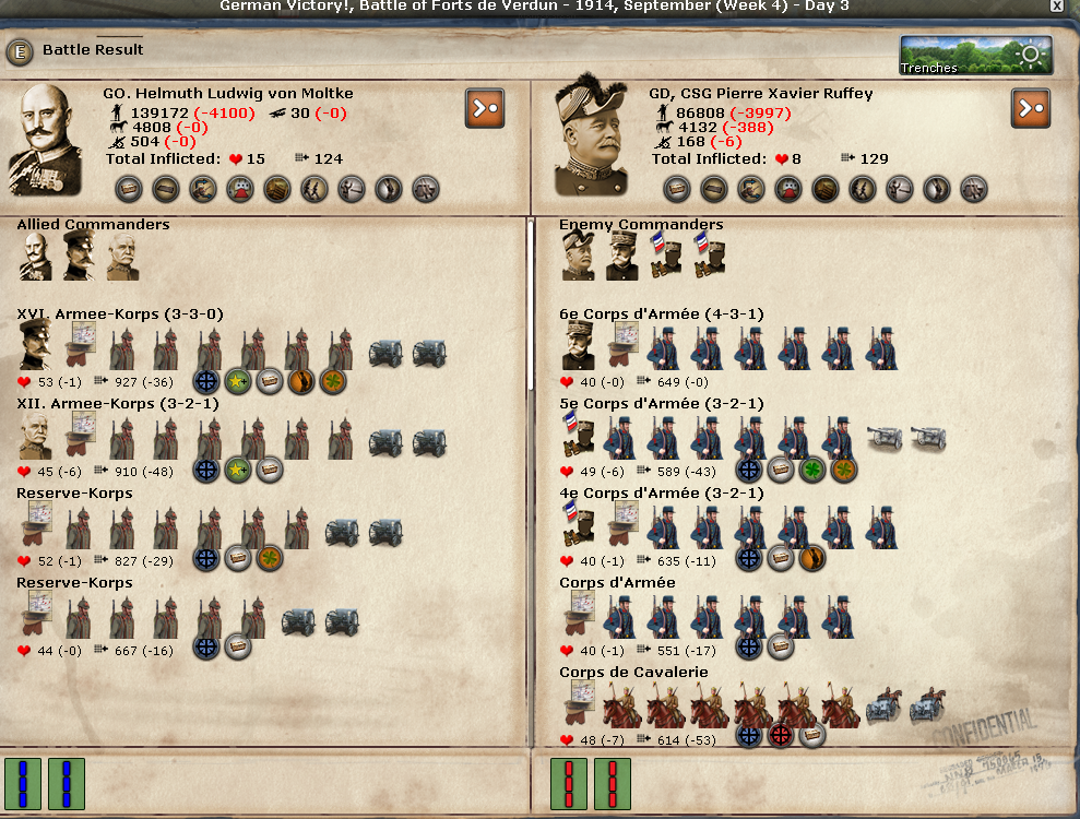 One guy defended with 20k vs. 140k and caused double the hits and won the battle versus the French. Molke attacked in Verdun, which is showing "trenches" as the terrain. That's new to this mod, but I'm assuming it provides a defensive bonus. Equal forces and Molke still won. Frontage also comes into play, so though you may have a lot more forces, the frontage may limit the results.