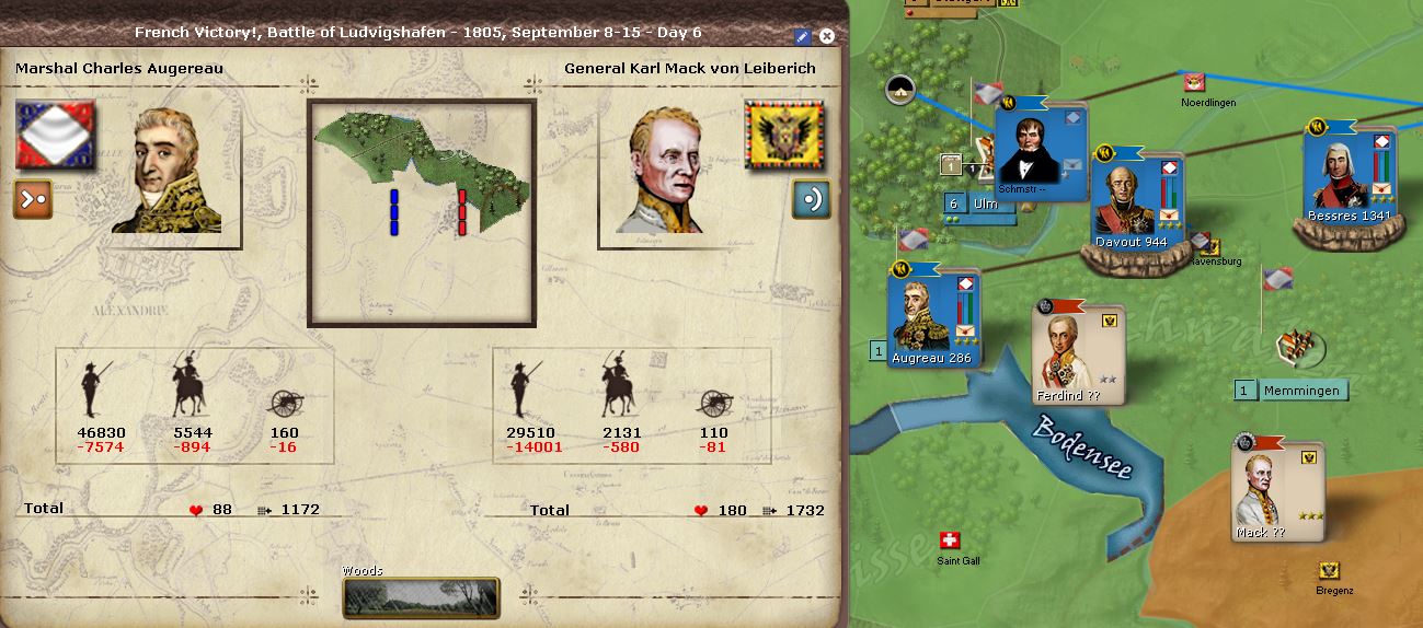 veji1 wrote:I know it's the mid 1805 campaign so the Austrians are made to get trashed, but damn some battle results are just extreme. I would like to see those Mack losses (40k) against Napoleon explained : is that surrender from inside a structure ? battle losses ? If it was a battle on the field, the more "historical" way this army would have been destroyed would have been tactical and then operational pursuit, as almost from the get go the Austrians would have been trying to extricate themselves from battle.