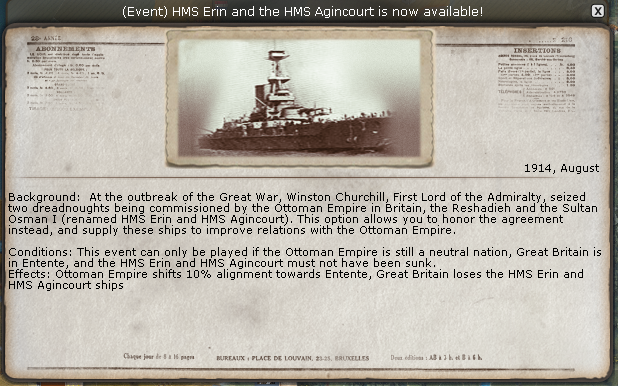 we played the Japanese Treaty and the Neutrals Blockade - we will not give the Ottmans the dreadnoughts, as we want them to join the war as early as possible - that will trigger the Armenien Masscare and by that bring in Italy, Greece and the U.S. much earlier to join the WE - plus Turkey is very weak (in the mod even weaker than in Vanilla) and rather a liability for the CPs ;-D