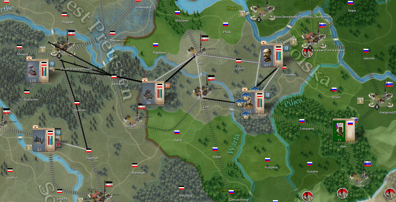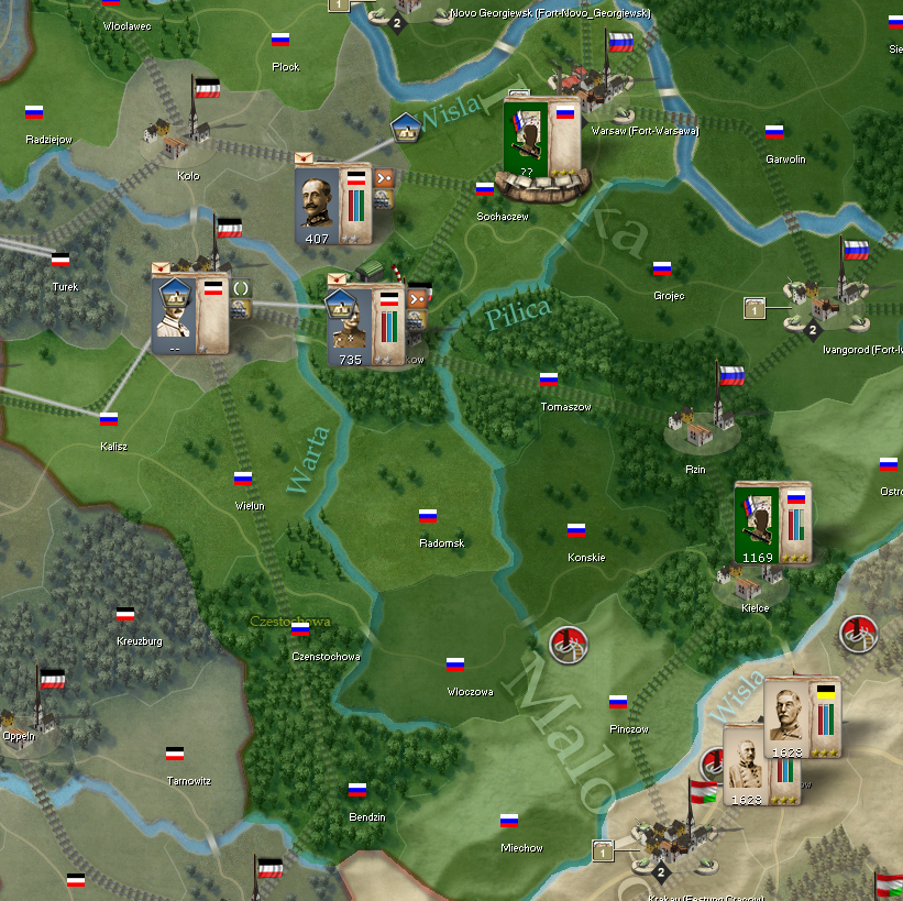 Near Warsaw we seem to be finally drawing the attention of the bigger Russian stack - which frees up the A-H force for the defence near Budapest. Lets see, if the Russians will try to attack us - due to Hindenburg not spawning we cannot organize our forces there in a big stack...