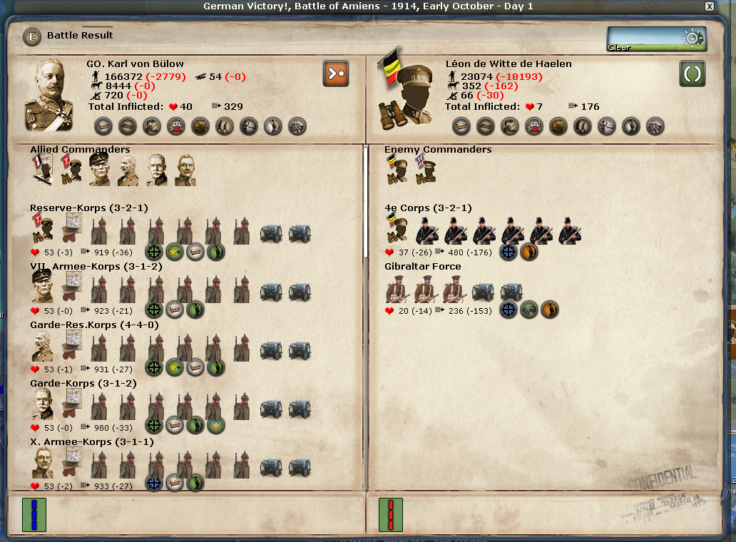 The battle of Sedan is one of these typical frustrating battles, where I am attacking with 10:1 numbers and still take higher losses thean the defender - a victory none the less. Another victory around East Prussia and the siege of Kowno has begun. The first battle with the BEF goes well as well and my hopes for my ideal defensive line are rising from turn to turn ;-D.