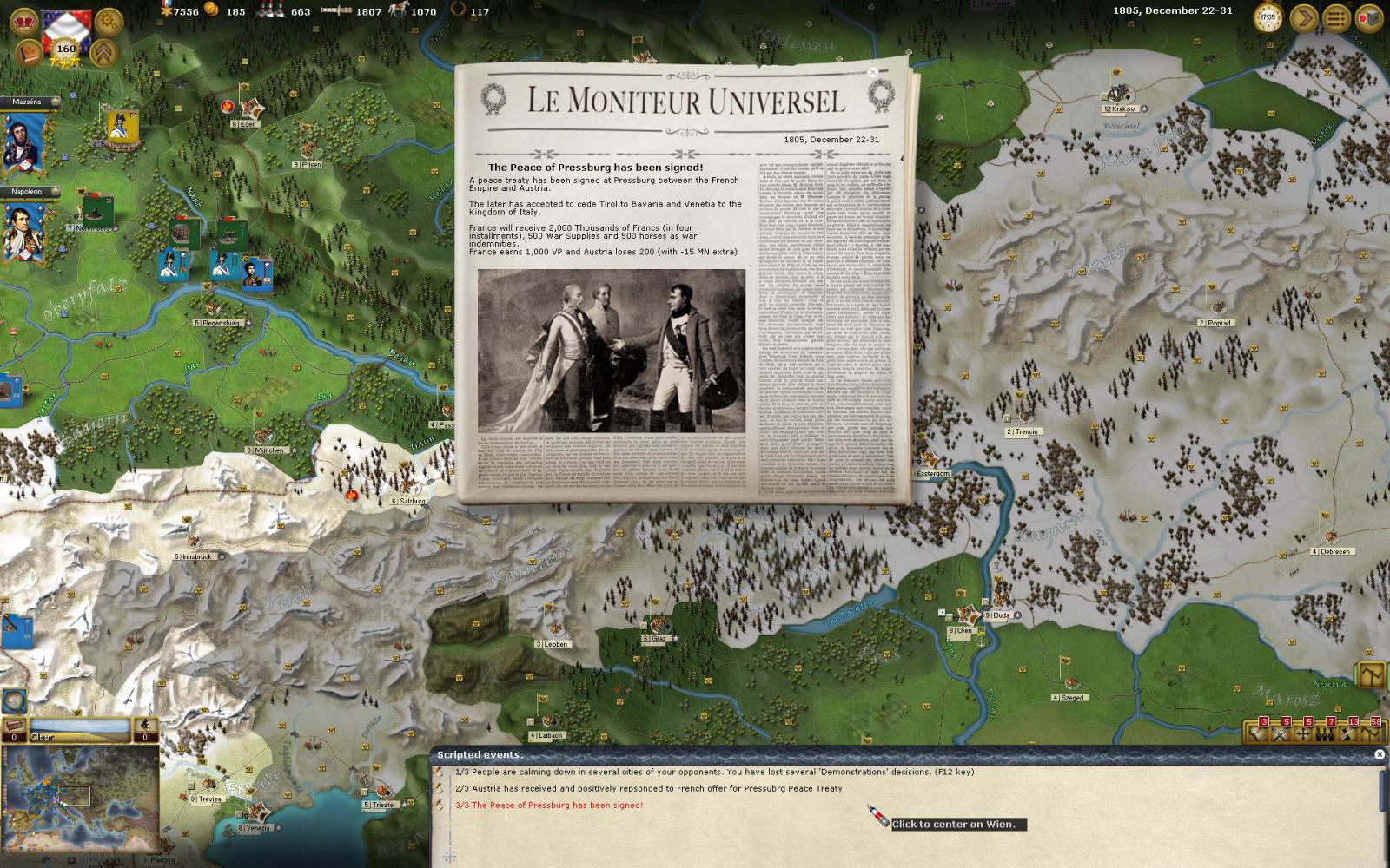 Playing France, Austria is beaten. I get the option to fire the treaty in october 1805. I select it. Next turn, I get the message saying France proposed the treaty. Then nothing for 3 turns. Then Austria propose peace for money only. No other notification about Pressburg. Option no longer available in F4. F6 will only let me get money or disband army/fleet.