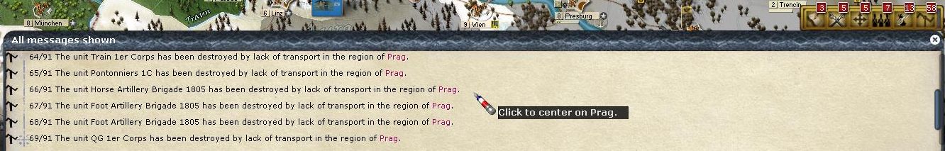 Playing as France, August, 1805 Campaign. Pressburg Event fired, but, after waiting several turns, wasn't accepted by AI Austria. I restored back several saved turns to when France received the option. The turn after, I reloaded as Austria and accepted the event. On the next turn, the Treaty implemented, but Bavaria was still occupied, and did not receive Tyrol. Also, my I Corps was in Praag (supplied), but was destroyed due to "lack of transport."