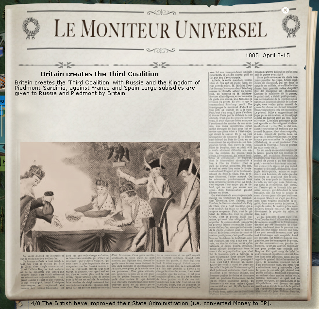 In the second week, we heard that Britain has created the Third Coalition with Russia and the kingdom of Piedmont-Sardinia. Therefore these two countries automatically declare war on France. In addition, the Kingdom of Sicily also declares war to France emboldened after signing an alliance with Britain.