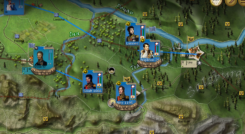 In Austria, Ney and Lannes will be on top of Wein this next turn. I'm not going to outright assault as he may have some entrenched forces lurking around or behind the forts. Nappy will support them.
