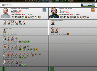 FYI, Huger has the artillerist special ability, but he really sucks as a Division commander, due to his low stats. Fortunately, the artillerist ability works for the entire stack even if Huger is a lone General. The artillery fire every round because they are support units, so I try to put one of my best Generals in command of the artillery Division. In the stack you have with Beauregard, that would be Magruder. Just my two cents worth of advice. You are really doing well and don't need any help. Perhaps I should give some advice to GWGardner.