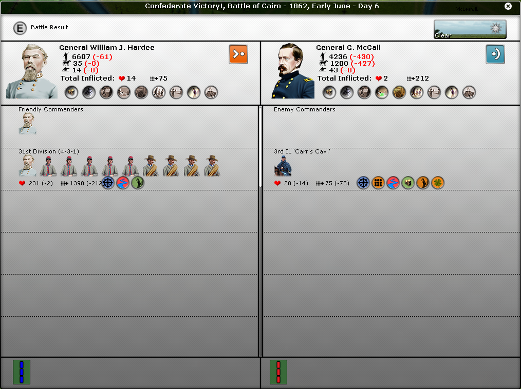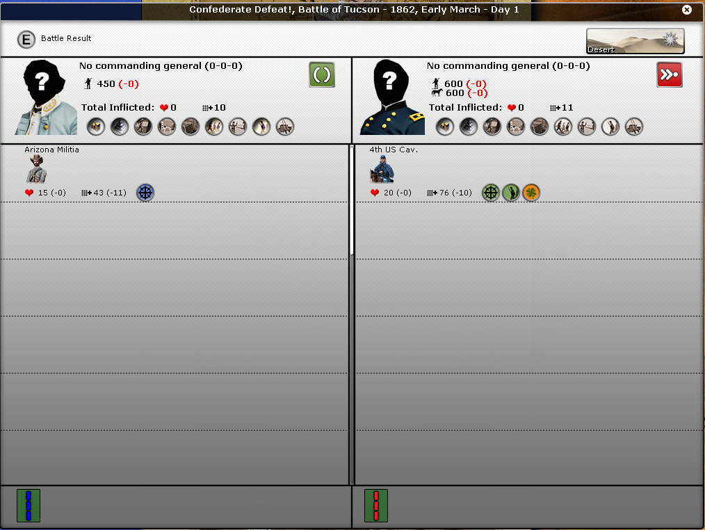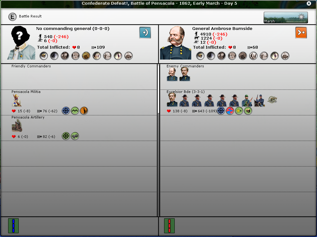 FYI, I noticed in many of your battles that you don't seem to have the intrinsic supply icon on the battle report. It's the round icon with three boxes and a green background under the troops icons. In fact, in the battle of Pensacola, Pemberton seems to have the "out of ammo" icon.
