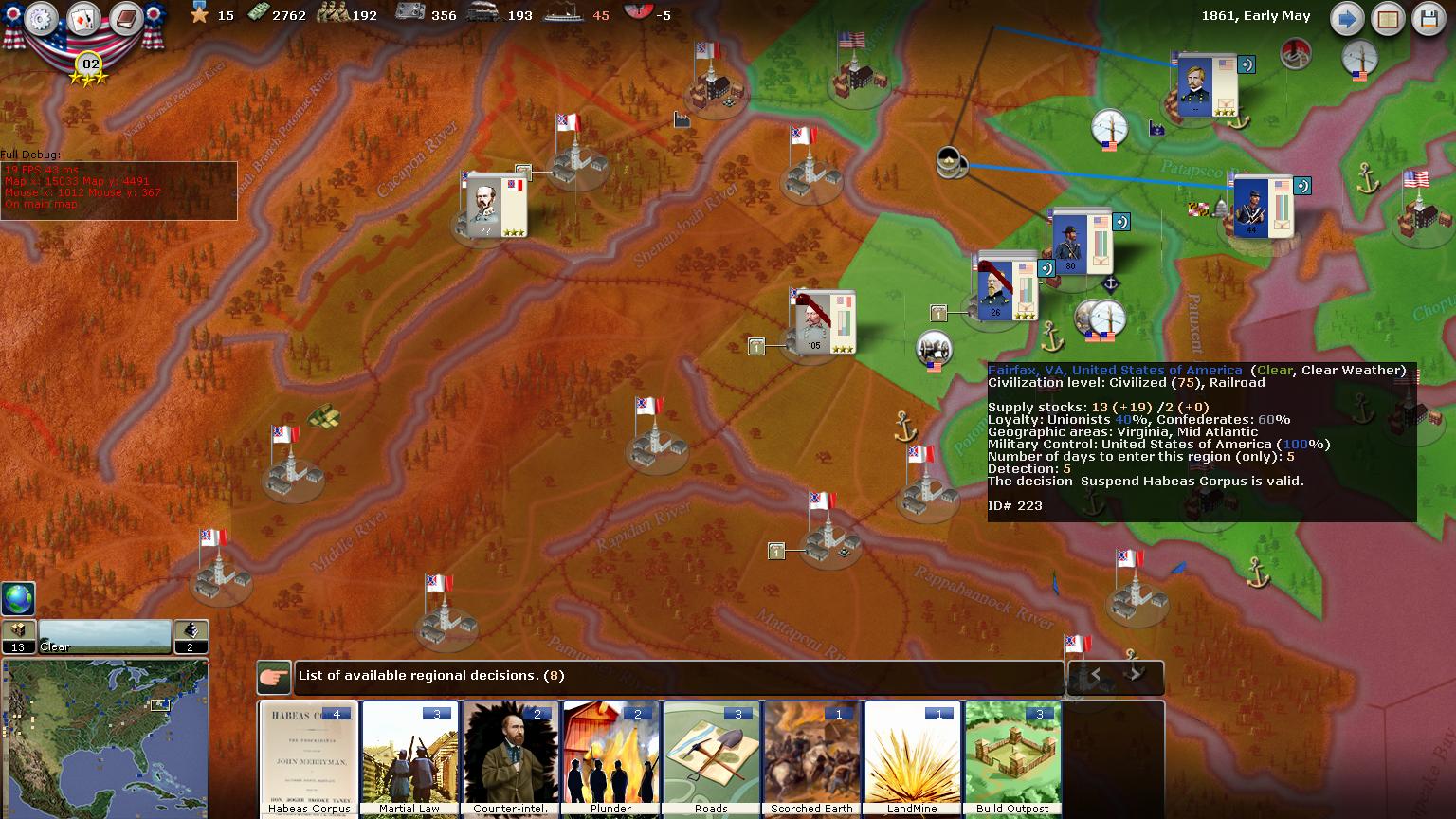 It was a big decision weather to go south or east, so we chose south to pursue Johnston in Charlottesville. Bee in Fredricksburg I think will sit tight becuase I left an army to cover my rear in Culpeper VA.