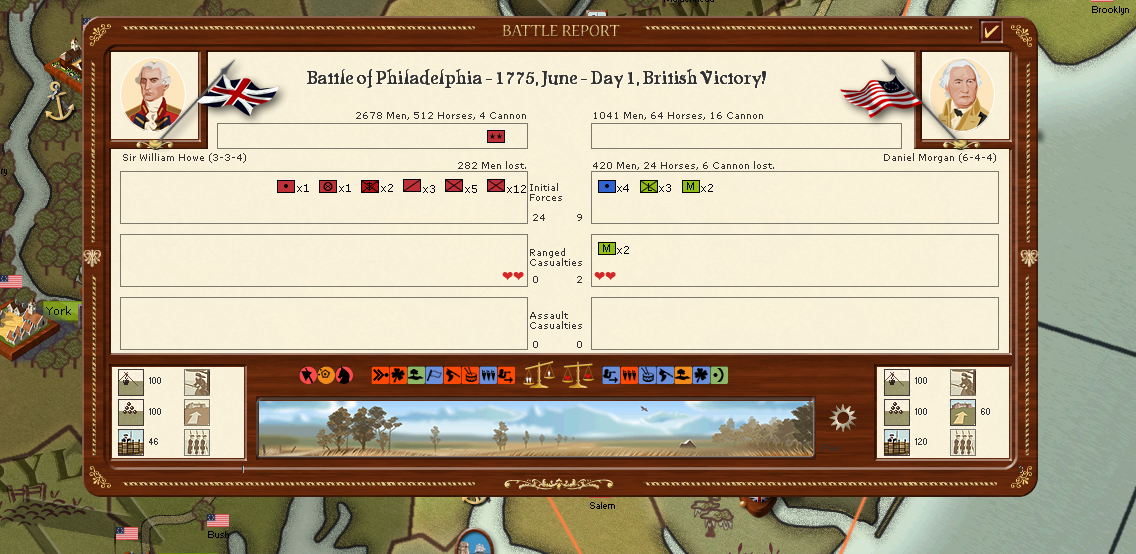 2) IMO, this 1775 scenario has a fatal unbalancing flaw, in allowing the British to immediately take Howe out of Boston on Turn 2, and send him anywhere. This allowed me to take Philadelphia very quickly, before the USA faction even has a chance to react (I've playtested it, there's nothing the rebel player can do to contest the landing if it's enacted immediately). New York is slightly iffier, but it's very easy to take as well in 1775. Losing Philadelphia in particular is devastating to the rebels, as some of their initial reinforcements come to this region, and immediately get stomped if its British held.