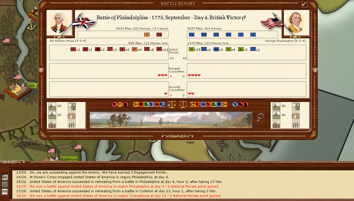 In the end, it didn't matter, as Washington launched an ill-advised attack against Philadelphia with a rabble of militia, and was repulsed with heavy losses. After his retreat, the rebel army disappeared from my intelligence, I assume into the Southern colonies or back into the viper nest of the New England heartland. Eventually Washington will meet the hangman's noose, but for now, other priorities must take precedence.