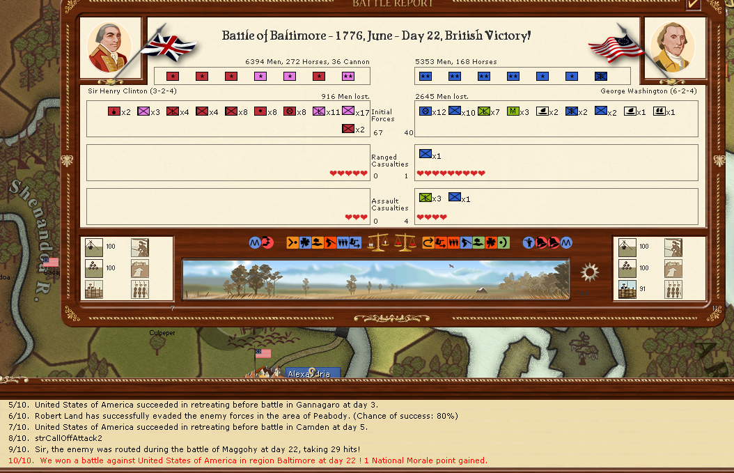 Meanwhile, Clinton, now commanding the largest British force in the colonies heads south through Maryland to link up with Burgoyne's army. In doing so, his hefty 1400 CP stack runs straight into Washington and the core of the Continental Army, which evidently had been hiding out in Baltimore. Washington's second run-in with the British does not go well, and the colonist again are forced back with heavy losses. Clinton's forces are a bit disorganized after this big fight, and regroup at Baltimore. Clinton's success earns his promotion to 3-star general, and while his forces rest, Burgoyne's army easily takes Richmond, and afterwards the rest of Virginia and Maryland are easily secured.