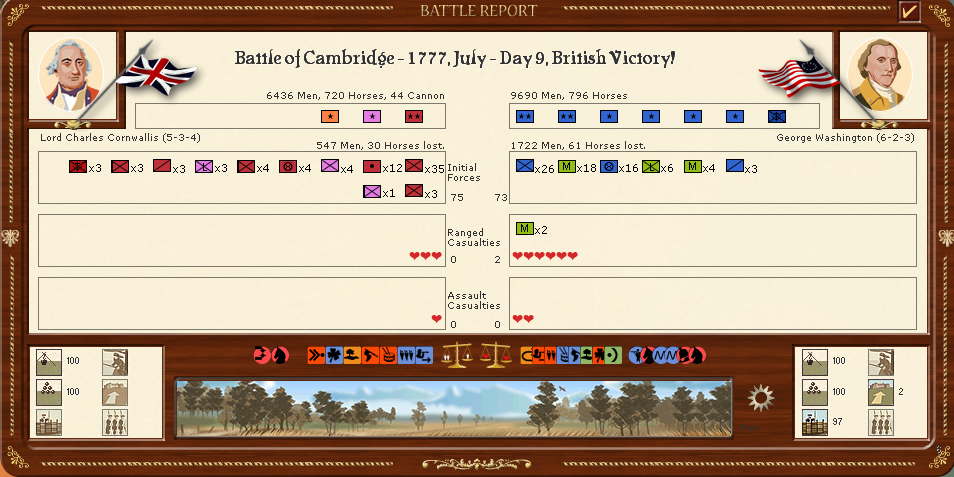 Anyway, it's a very interesting scenario, much like a boxing match of wearing your opponent out. I do think it's slightly broken in British favor, but this would be easily addressed by item #2. With that one small change, I think it'd be a very historical and tit-for-tat campaign.