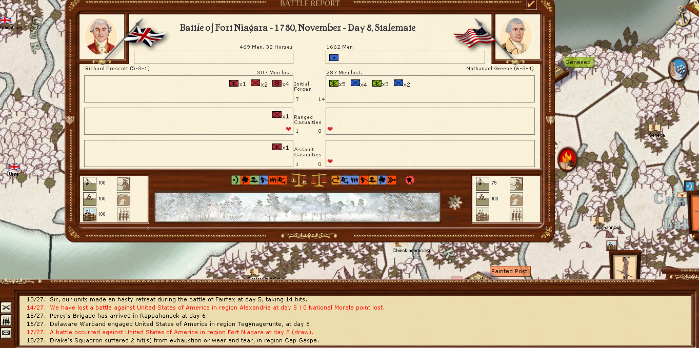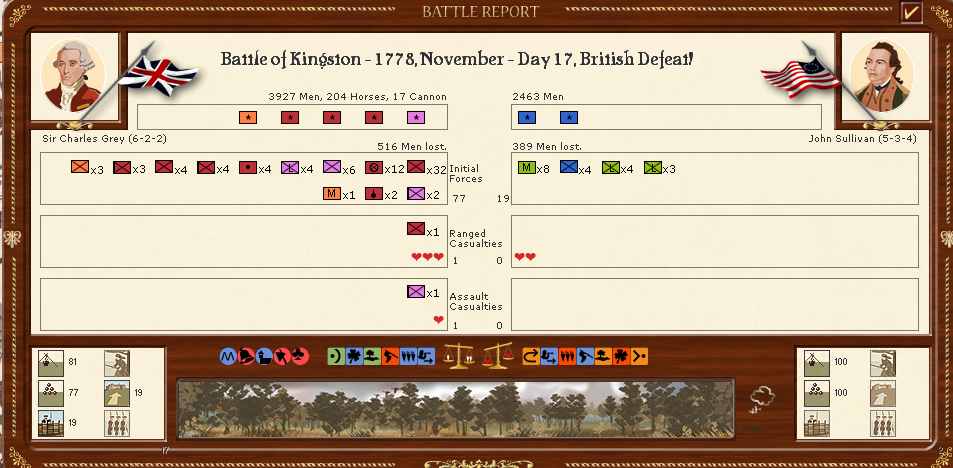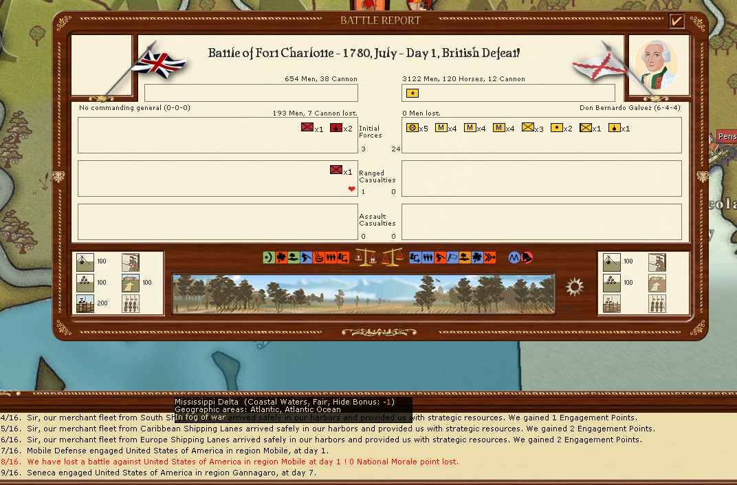 Altaris wrote:Quick update. We're up to August 1779. French took Savannah, GA and Wilmington, NC but have not pushed any further inland. Clinton and Burgoyne made a strong stand against Washington and the Continental Army at Boston, and Sir Grey is arriving with reinforcements to chase off Washington's army in New England. A Spanish force landed at St. Augustine but was obliterated by the garrison there (British only lost 24 men to roughly 1500 Spanish). We're almost exactly at the halfway mark of the campaign, and the last few turns have been good for the British. We'll see if our luck holds up through 1780, if so it may prove enough to bring the French and the Continentals to the negotiation table (notice I am calling them Continentals now... the Crown acknowledges some concessions will likely need to be made to bring this conflict to an end now).