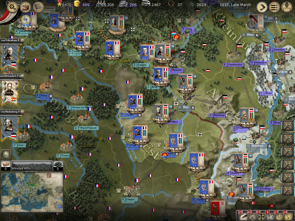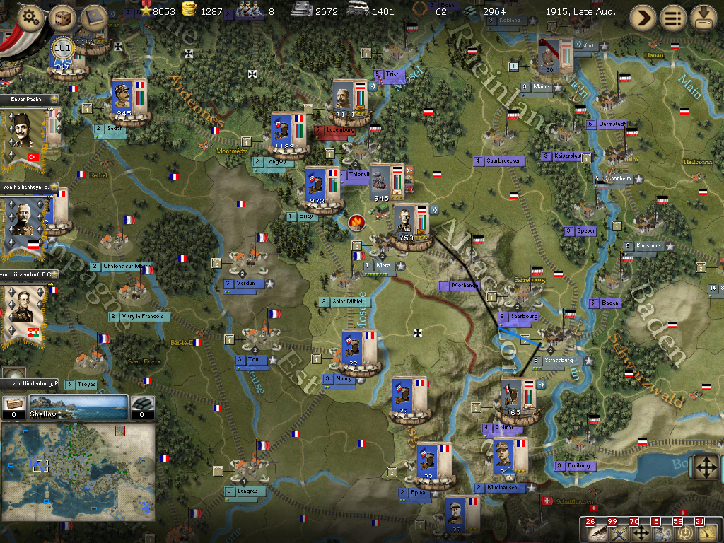 [color="#0000FF"]Southern France:[/color] The attacks from Metz onto Saint Mihiel haven't worked in the past, however, it appears to have just the one korps with 275 PWR outside the city and just a supply unit inside so we'll use a conservative assault at least for a diversionary tactic to hopefully spread the northern forces out more. The korps in Luxeuil will rail to Belfort to regain cohesion. The OHL is inactive so he'll have to stay put for another turn.