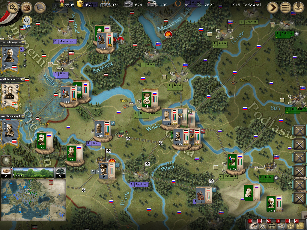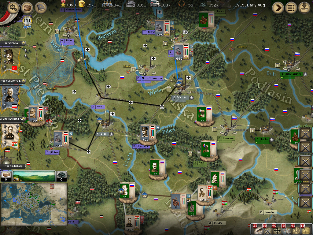 [color="#FFFF00"]Poland:[/color] The assault on Warsaw went well, but wouldn't you know it, a lone artillery brigade defends the city! It also appears the four Russian stacks to the west have been cut off from supply. The forces in Novo Georgiewsk and Ivanograd, however can be used in a desperate attempt to save Warsaw, but my PWR currently stands at 2542 in Warsaw with von Hindenburg present.