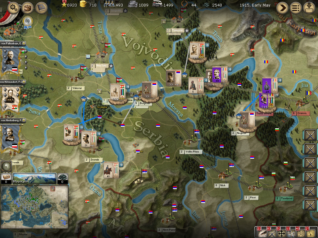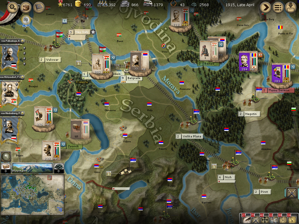 [color="#8B4513"]Serbia:[/color] The Romanian forces have not fought well so far as they are having trouble being activated to assign them korps command. This is starting to happen this turn. I was hoping to encircle Belgrade, but will probably move von Krasnik's armee eastward to assist my other forces in Serbia.