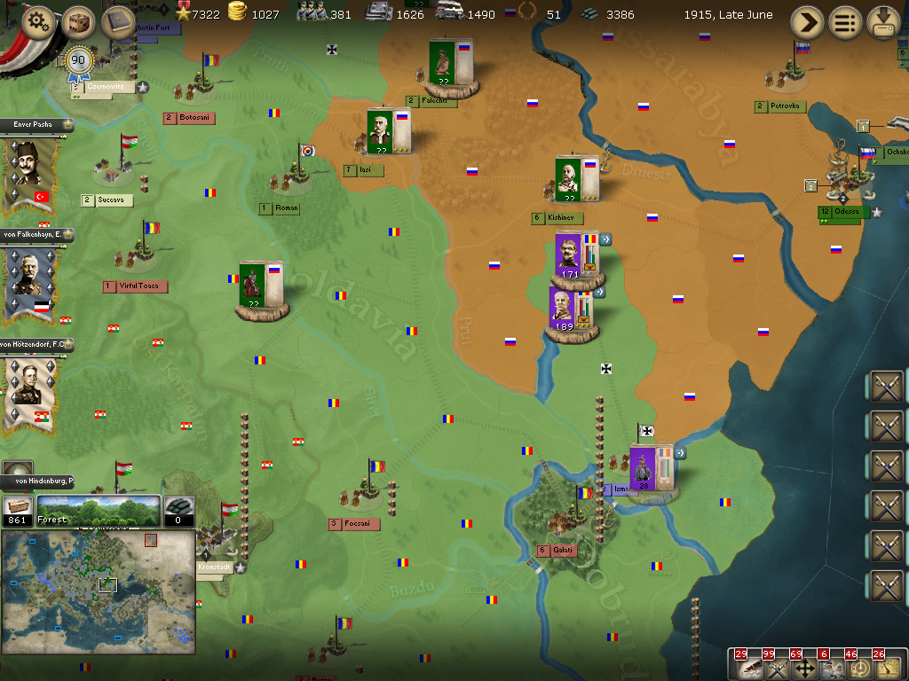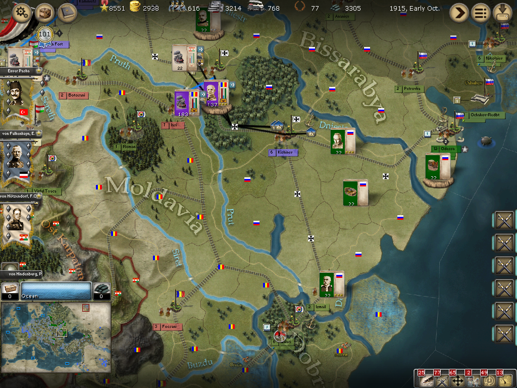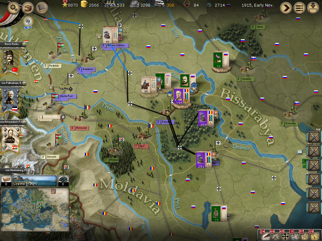 [color="#008000"]Southern Russia: [/color] We had a successful battle in Izmail and are chasing Saltza's very weak infantry division in Tatarbunary. We are also attacking a garrison unit with a Romanian Armee just north of Falechti.