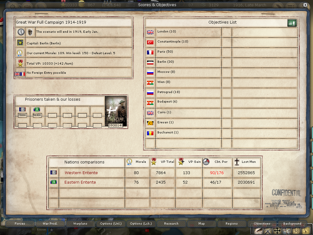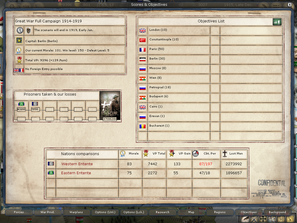 The Overall Situation: Our PWR rating is in much better shape. The Triple Entente is now only 123 compared to the CP and they have almost 500k more losses than us.