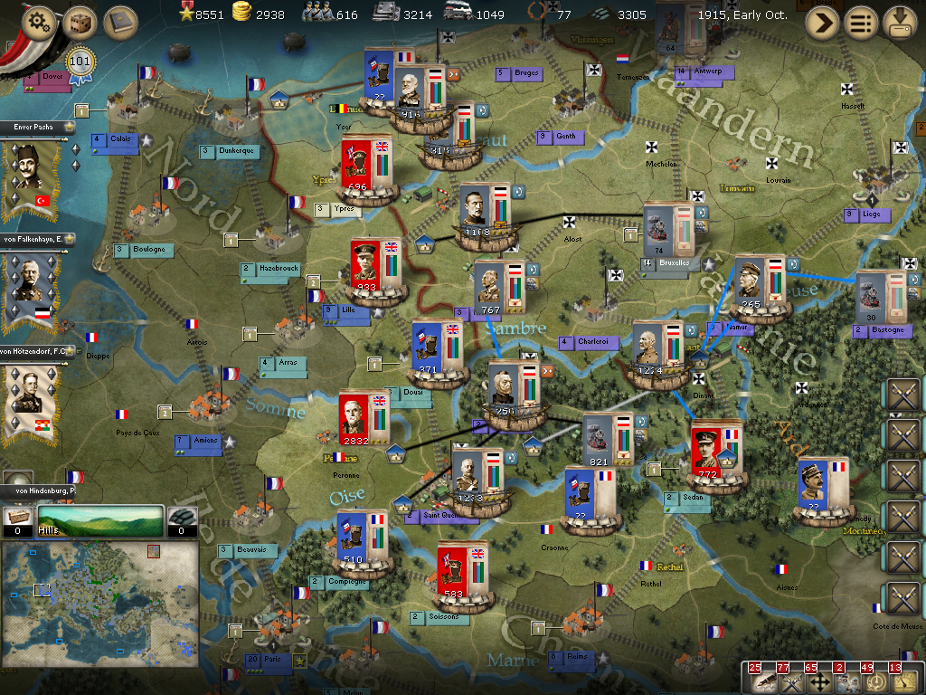 That seemingly innocuous British stack in Tournai actually has a huge force of three 3-star leaders, four 2-star leaders, a ton of regular units, 5 artillery units and 8 supply units. They are not on leave right now!!