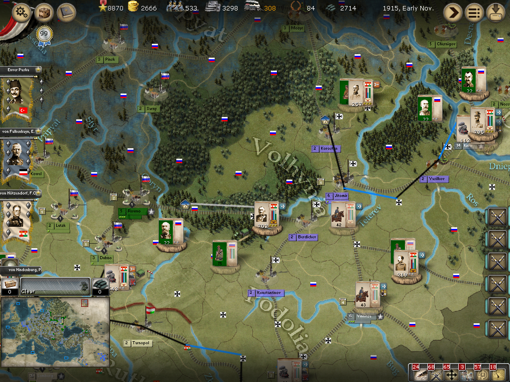 [color="#008000"]Central Russia:[/color] Weather is preventing much of anything but we are railing some small forces to Konstantinov to help out in the siege by a very battered Russian korps. Von Boehm-Ermolli is chasing an infantry division just nw of Kiew.