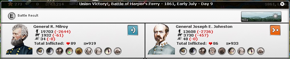 Thanks. We'll see how it goes. I play a very regimented style in the early war, trying to recreate history with variations I find interesting and plausible. This game, my variation is that the Union is going to prioritize recapturing federal installments. So the Battle of Hatteras Inlet is coming soon, as is a (probable) loss at First Bull Run. Capturing forts is easy, while Harpers Ferry and Norfolk are hard, so I'm going to wait on Norfolk, but you've already seen a bit of the story at Harpers Ferry.