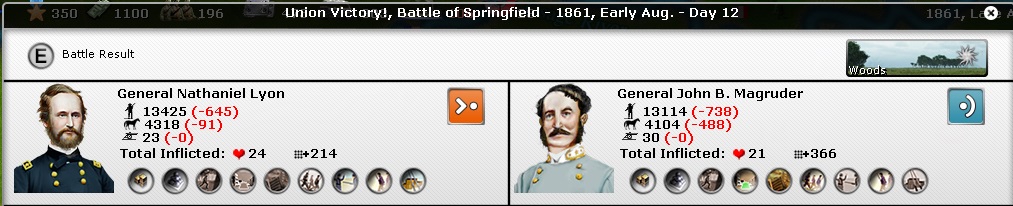 In late September, Lyon consolidated his hold on Springfield, capturing the city and its militia garrison in its entirety. He also destroyed the Arkansas light infantry brigade, a total of 1290 confederates while losing only 123 men when the 2nd Missouri Brigade charged prematurely. Lyon, Morrell, and Wood all performed excellently. On the 30th of September, Magruder returned to the area attacking Lyon's force with materially the same force as earlier in the month, totaling now 7,600 men against Lyon's now 13,500 men - having replaced his losses in a ratio of almost 1:1. Lyon won this battle as well, losing about 1,300 men to Magruder's 1,100. Magruder's McIntosh brigade faced particularly troubling losses.