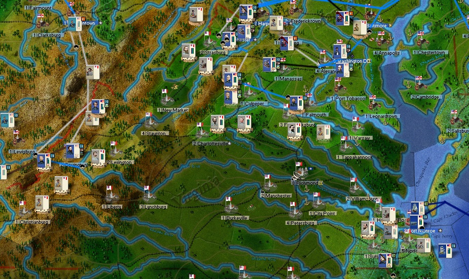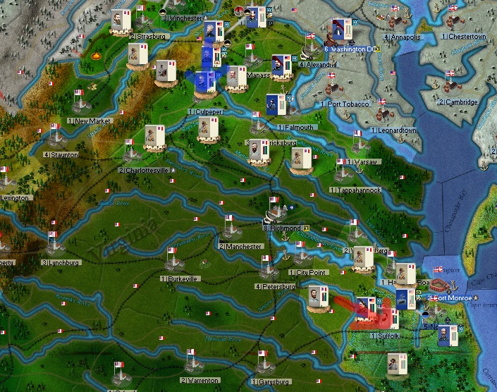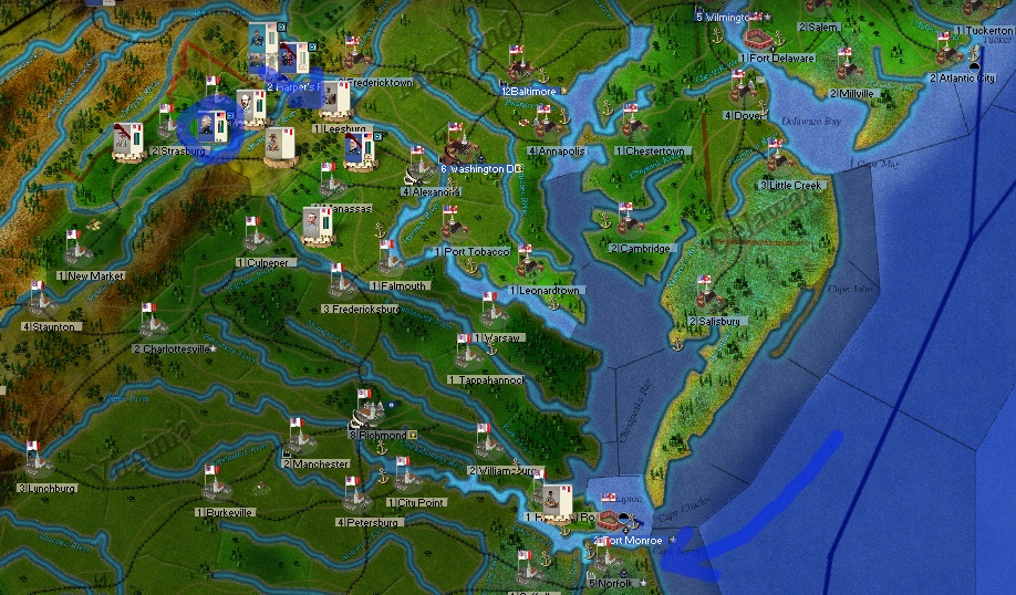 In Virginia in an apparent error, General Jackson has moved by rail from his victory at Norfolk to the Shanendoah Valley, joining Longstreet there. General Butler moved spent a few weeks in Atlantic City and planned to return to a now poorly defended Norfolk where he could rejoin with Hooker, who was moving back towards Norfolk/Edentown. Jackson arrived in the front of General Kearney's camps near the last day of the month. The two lines were very close, but Kearney had total control of the area and it was likely that a fight would break out between them on the first few days of the next month - although Jackson left open a possibility of a quick, passive retreat. Union forces had control of the Manassas Gap rail lines through Clarke county, and General McDowell's Army and General Franklin's Corps were ordered to move into Shanendoah. Further, they were ordered to continue on, Franklin to Strasburg and McDowell to New Market. In this way, over 80,000 Union forces were committed to move into regions where they could fight between 40,000 and 60,000 Confederates, defending on the sizes of Longstreet's and Jackson's corps and if nearby forces under General Ruggles and General Holmes could get involved. General Buell remained in Millboro, Virginia on the West Virginia border and was being joined by a small cavalry division now under General W.H.L. Wallace and another small force coming from Connecticut. This force put pressure on both of these generals and reduced the ease of Jackson and Longstreet to potentially retreat to the South West.
